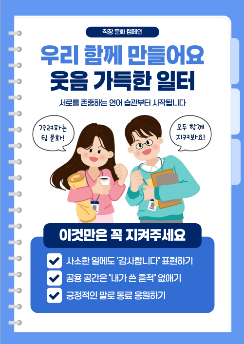 홈전체게시판정보게시판 정보게시판 직장문화캠페인-웃음 가득한 일터(서로를 존중하는 언어 습관) 작성자 관리자 작성일 2026-03-17 17:51 조회 57 좋아요 0 싫어요 0 인쇄 « 장애인 이동권 지원 프로그램 '초록여행'을 아시나요? 여행가고픈 분들 다녀오세요~ 모바일 장애인 등록증 신청 방법에 대해 알아봅시다! » 목록보기 답글쓰기 Powered by KBoard